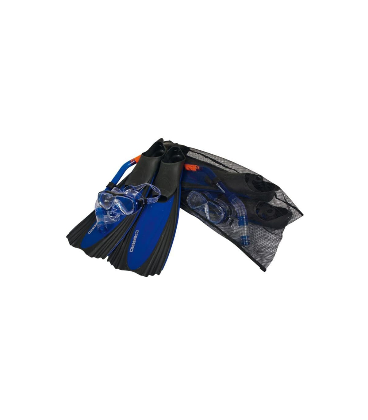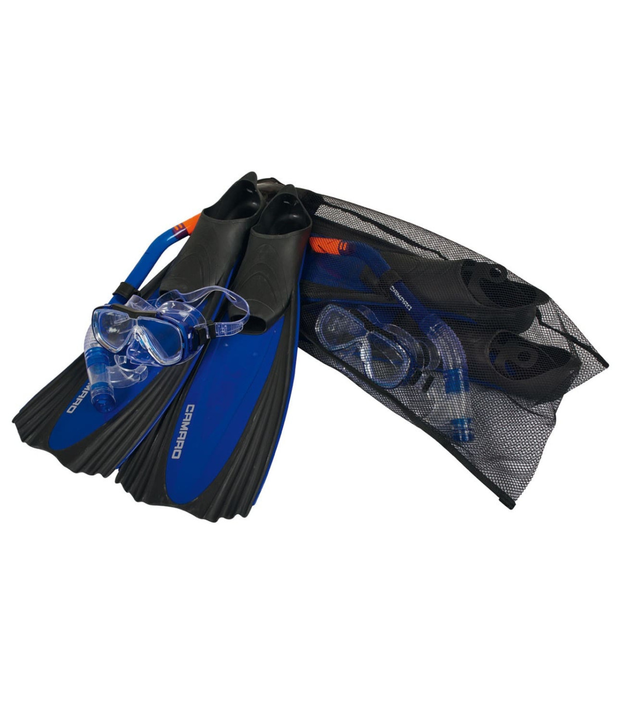 Diving mask: - tempered glass lenses - face skirt and strap made of soft, skin-friendly TPR rubber Snorkel: - tapered top prevents water entry - efficient cover of valve - easy to attach to the mask Fins: - streamline design - extremely lightweight - flexible middle section made of EVA+PE for efficient paddling