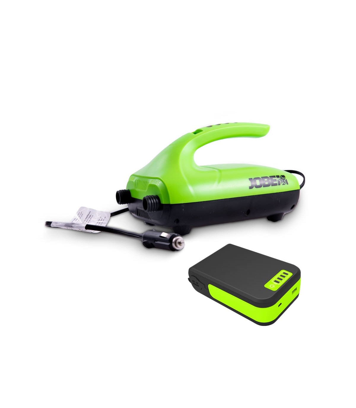 Meet the Portable Electric Air Pump with Bag! This little electric powerhouse will do all the work for you and makes sure you're ready to paddle in minutes. Provided with a Halkey Roberts Valve to connect your pump to all Jobe inflatable paddle boards. Thanks to the separate battery or the cigarette lighter plug you can hit the water wherever you want with ease! We've added a bag to give the pump extra protection while transporting.