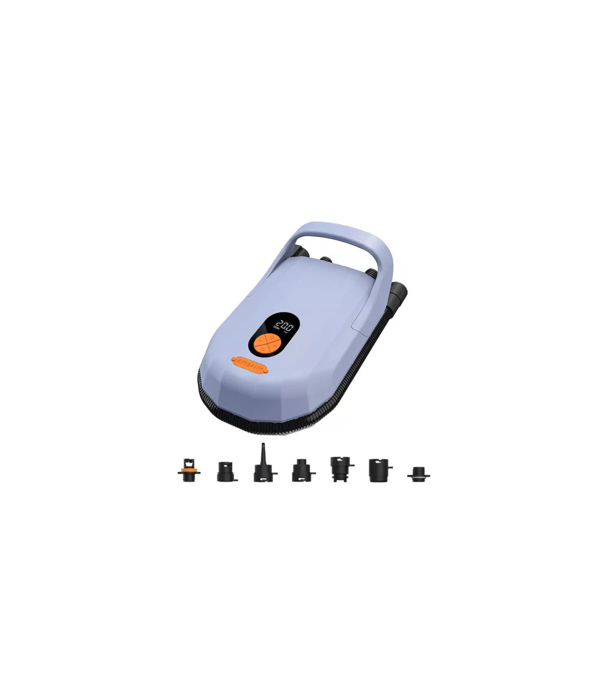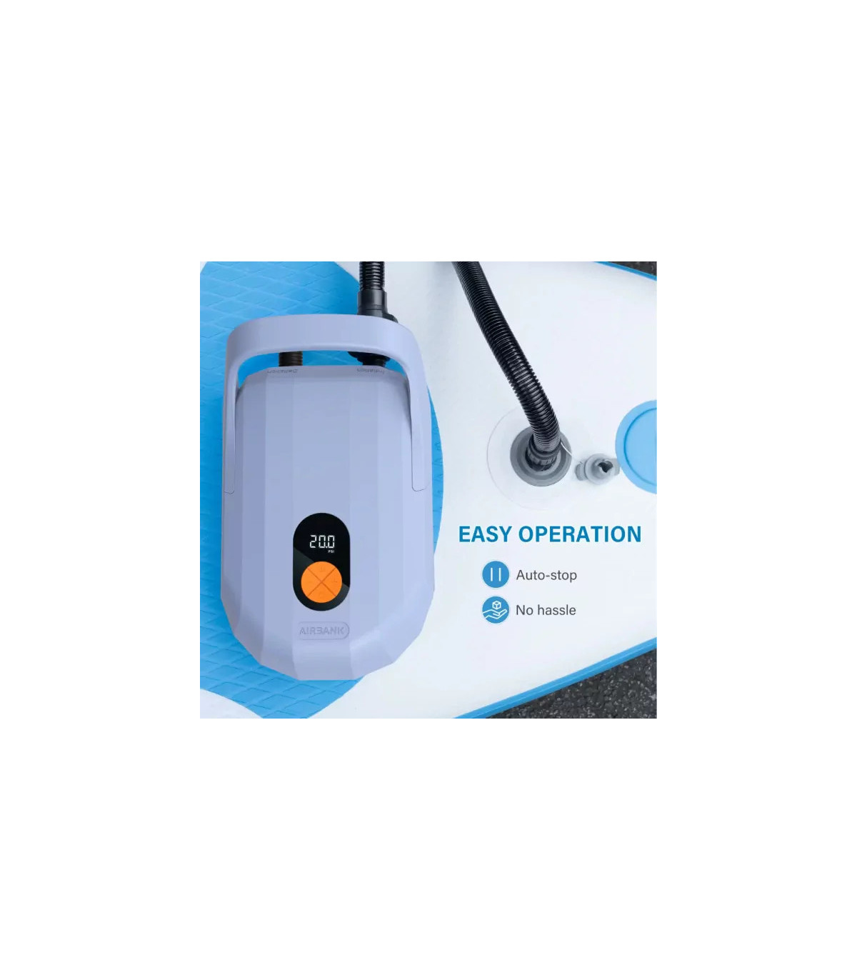 The Airbank D6 Pro Rechargeable Pump is a powerful and portable air pump with a rechargeable battery, designed for inflatable boats, SUPs, kayaks, and other equipment. It features a dual-motor system for fast and efficient inflation, along with digital pressure control for precise operation.