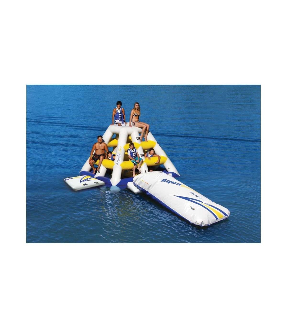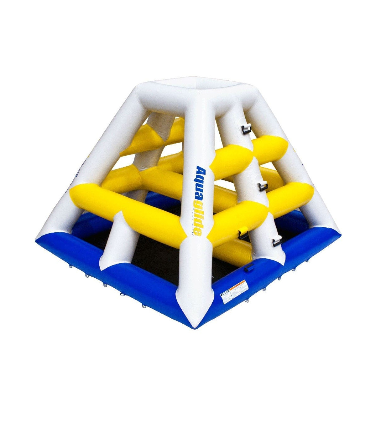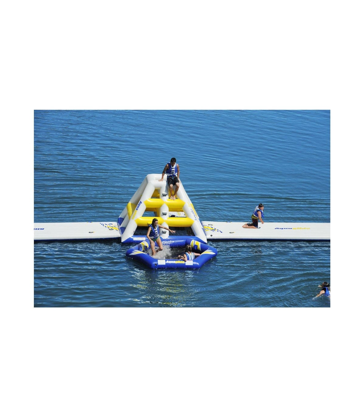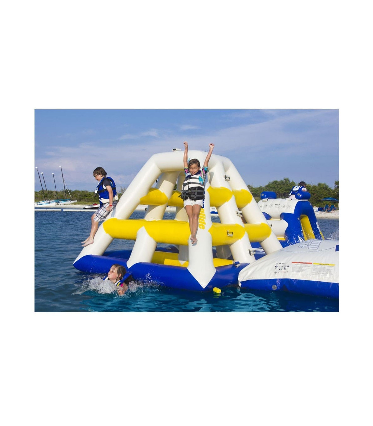 Jungle Jim™ is a multi-use playstation for up to six people. Stable, six and-a-half foot tall pyramid features climbing, sliding, jumping, splashing and more. Outside climbing walls angle inward for convenience and stability. Interior mesh floors create outrageous splash zones. Once inside, climb up through the top with the inside ladder. Use the outside corner posts as exciting ‘drop zones’ for sliding, or leap from the level of your choice. Use as a stand-alone item, or add diversity to any aquapark. Suitable for all age groups. Connect Platinum™ accessories at up to four stations using Interloc™ system.