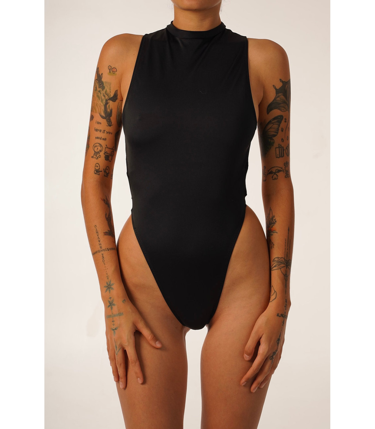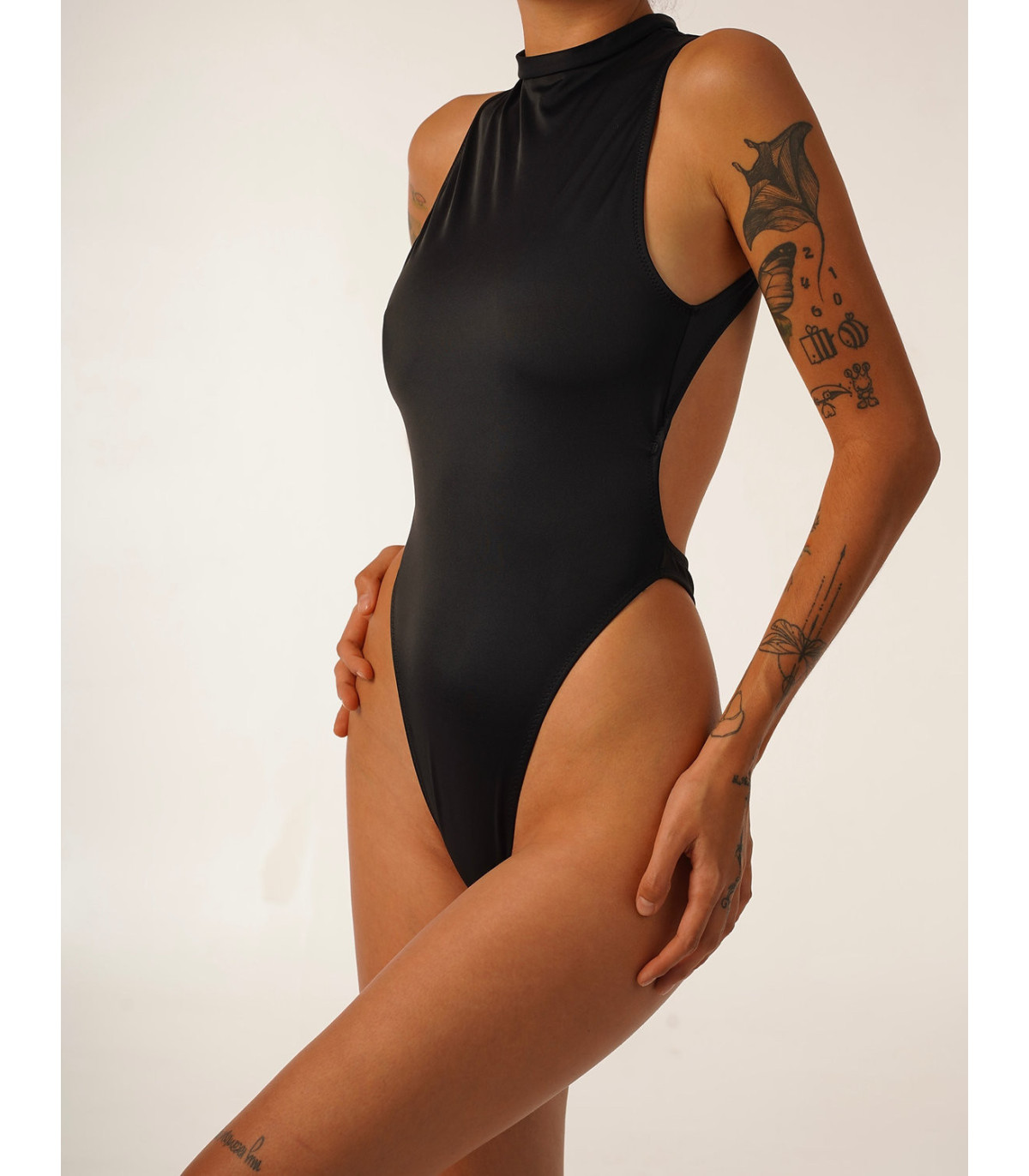 High neck elastic one piece, with a high leg sharp cut on the waist to extenuate the silhouette in a natural way.
