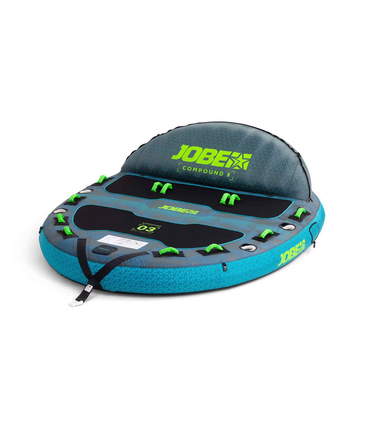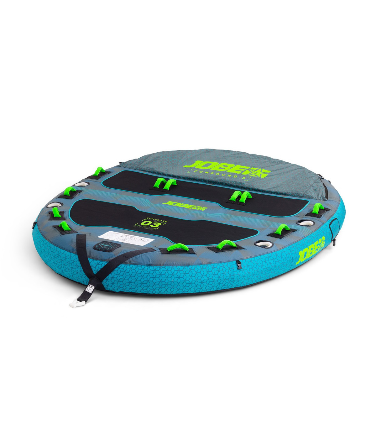 The Compound Towable 3P offers versatile fun on the water with a unique feature: you can deflate the backrest and store it with the closing zipper to create a flat deck towable. This design innovation allows for both comfortable riding and a streamlined flat deck for different towing experiences. Built for durability and excitement, it accommodates up to 3 people and includes 12 handles with neoprene knuckle guards, a quick connector for easy towing, and a safety chamber with water drains. Constructed with a robust 840 Denier nylon cover and 28 Gauge PVC, this towable is ready for action. It measures 106" x 84" x 29.5" (275 x 215 x 75cm) when inflated and comes with a 3-year warranty.