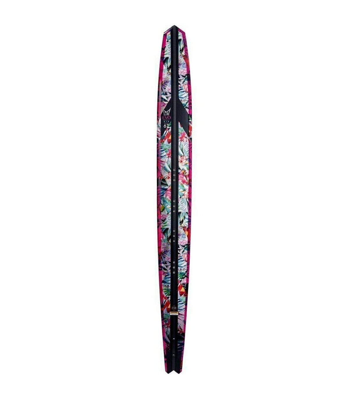 A water ski to introduce new participants to a sense of adventure and the experience of skiing on water; A water ski to break tournament skiers out of our routines, to reintroduce us to participating with the public and discover a new way to fall in love with skiing again; A water ski to ignite the Adventure Skiing Movement and define the EVOlution of water skiing. A thinly sculpted flexible body ski makes for smooth, effortless turns with unparalleled edge grip. This is due to the combination of flex and rocker that allows the EVO to continually conform to the water surface. Regardless of where the skier is standing on the tip or tail, the EVO is able to compress and give the needed turn shape and stability skiers demand. The surf inspired Fish Shape is a lower aspect ratio with wider tail, resulting in an ultra-efficient planing surface for performance at slower speeds and easier deep water starts. Clean Edge reduces drag by 50% over traditional ski edges. The EVO employs a Binding Spine: Minimized material underfoot to maximize torsional and longitudinal flex for enhanced turns, making it incredibly lightweight and flexible.