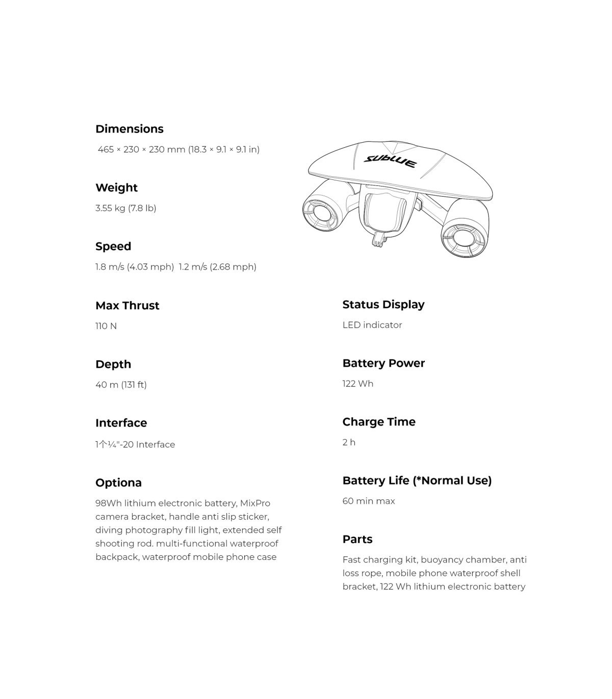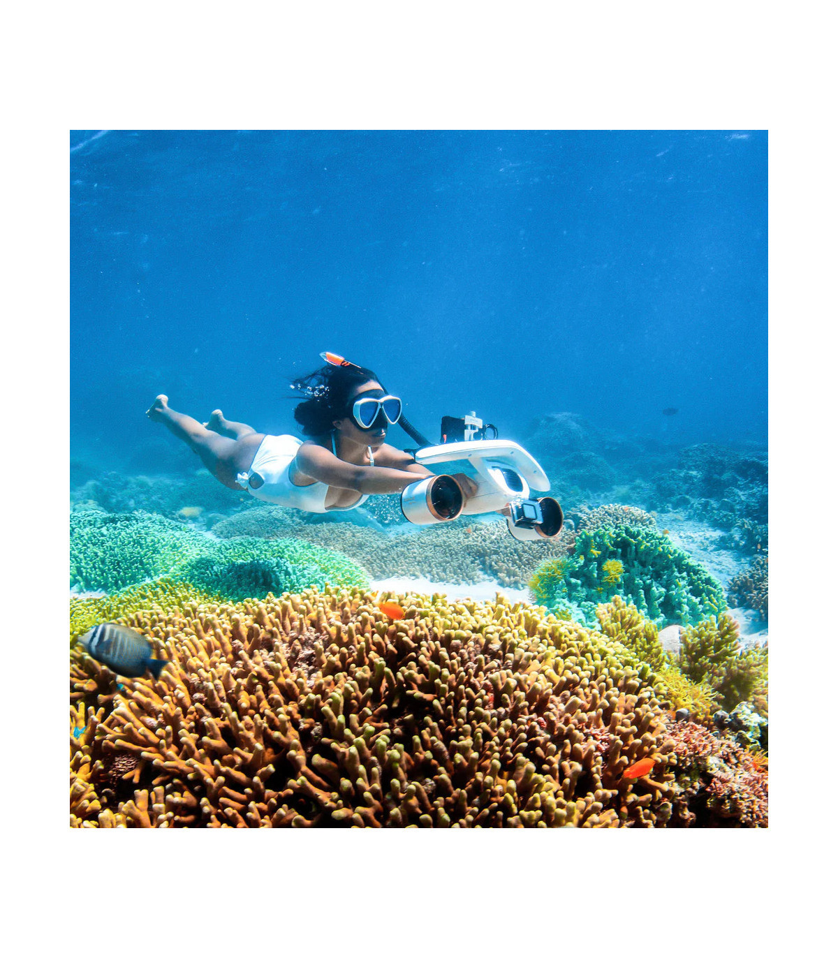 The world's first portable dual-motor underwater scooter with two-speed adjustment that can dive to 40m — reaching a top speed of 1.8m/s (4.0mph)!