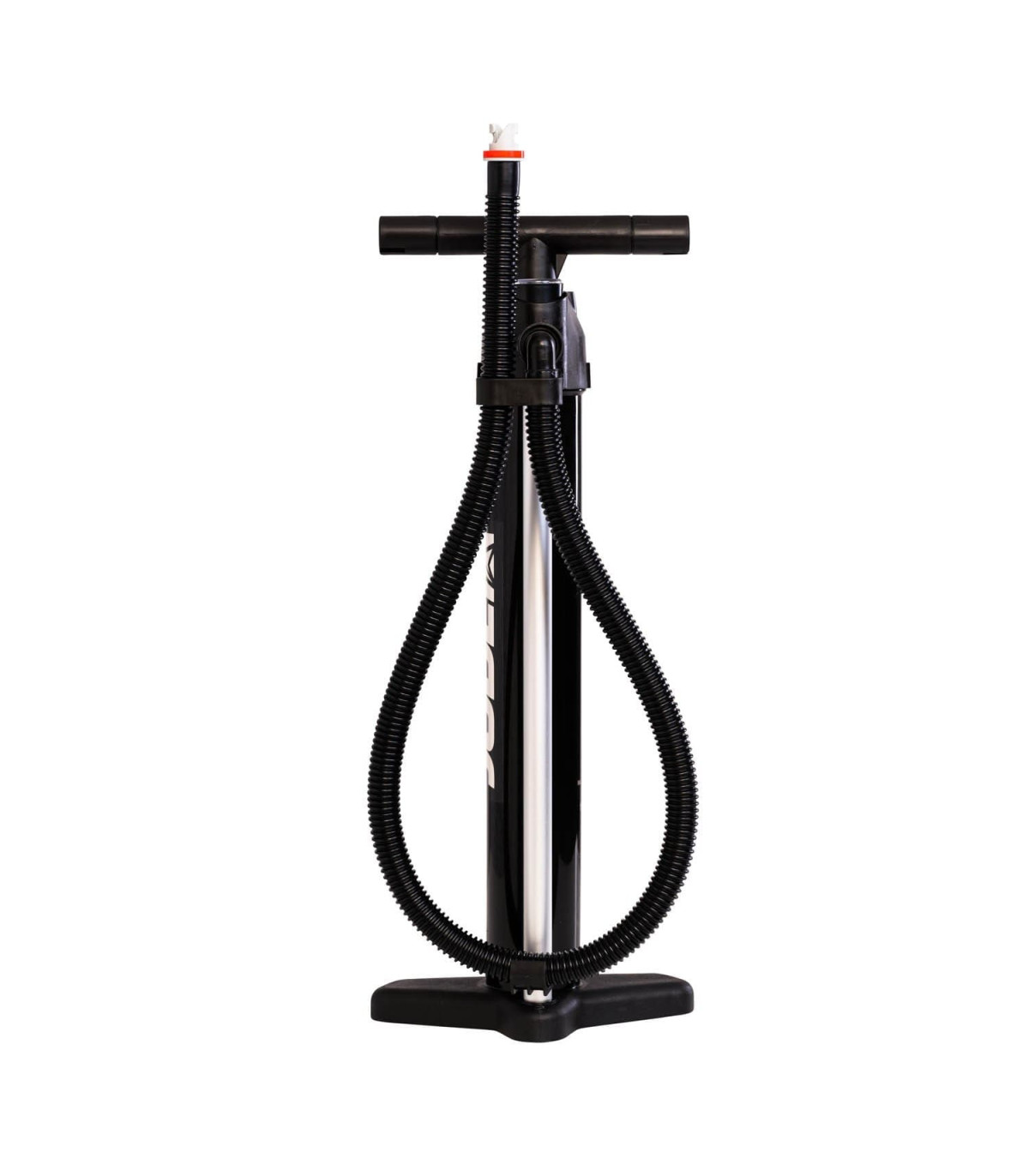 This pump has been specially developed for SUPs and is built to last. With the plug inserted it performes double action, by releasing the plug it transformes in a strong single action pump to finish the job. Equipped with an aluminium shaft, adapter, nylon carry-bag and replaceable built-in pressure it inflates up to 27PSI.