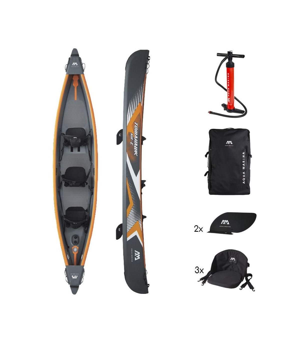 foam pad and pockets, 2 kayak fins, dual action air pump