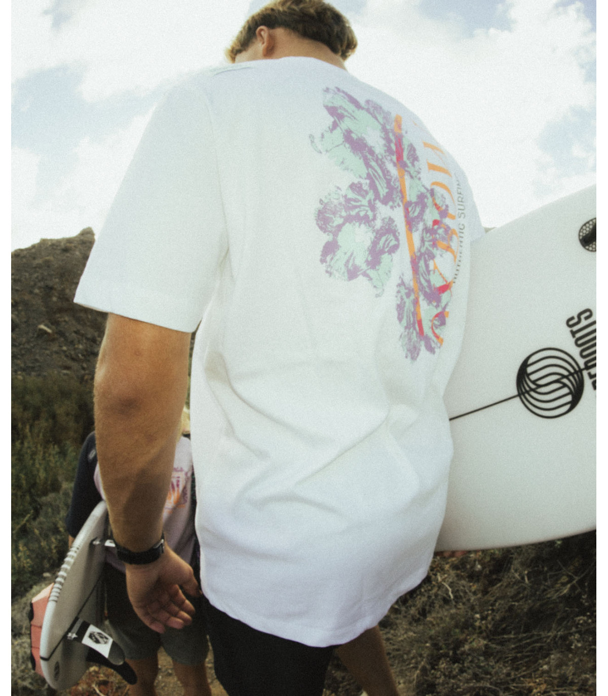 Crew-neck T-shirt, graphic print on the back with chest accent, woven label at the bottom, organic brushed cotton jersey.