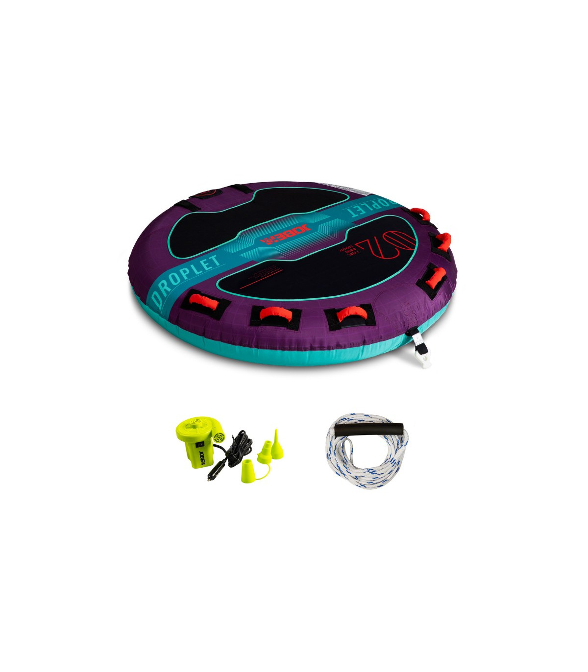 The Jobe Droplet has a 2 person capacity, but 6 soft and grippy handles to make sure you can hold on tight while bumping over the waves. This towable has an inner made of heavy duty 24G PVC and is fully covered in strong 420 denier nylon with a clean blue pattern. Package contains: Droplet towable | 12V pump | Tow rope