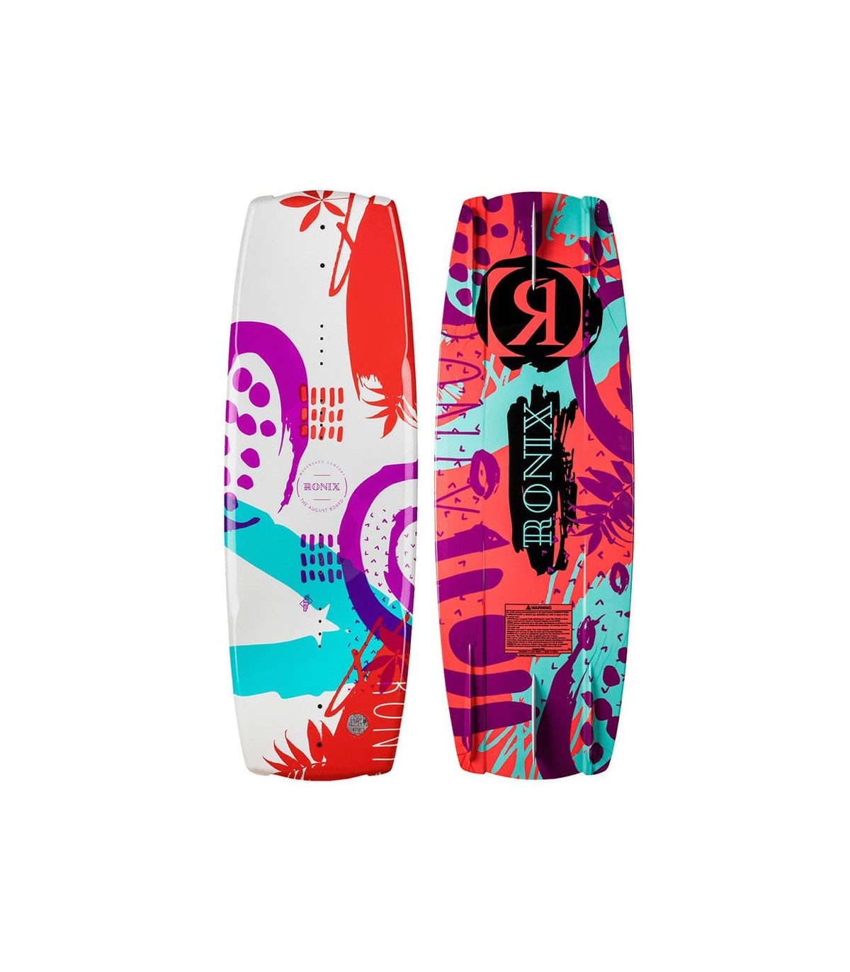 Every aspect of this girl’s shape/construction was designed for stability and progression. Designed and created by the girl’s modern prospect, recognizing that wakeboarding is the only board sport where your hips and shoulders aren’t parallel. A symmetrical shape with asymmetric features designed solely for the needs of the next generation of rippers. Your body is in an unbalanced position edging into the wake toe-side, so we created a thinner, sharper rail to help set an easier, more confident edge. Then on your heel-side your body is more comfortable in an aligned position, so we added a fuller vertical rail to generate more top water speed over the water. Come into the wake flat without much edge hold? No worries, we have more volume in the ends to help generate natural lift off the wake. Our Grom Glass offers a lighter layup for more feel with the water, and less swing weight in the air. A rockerline designed to assist a rider in a relaxed, neutrally balanced position. Be sure and check out the tropical scent hidden in the top of the board.
